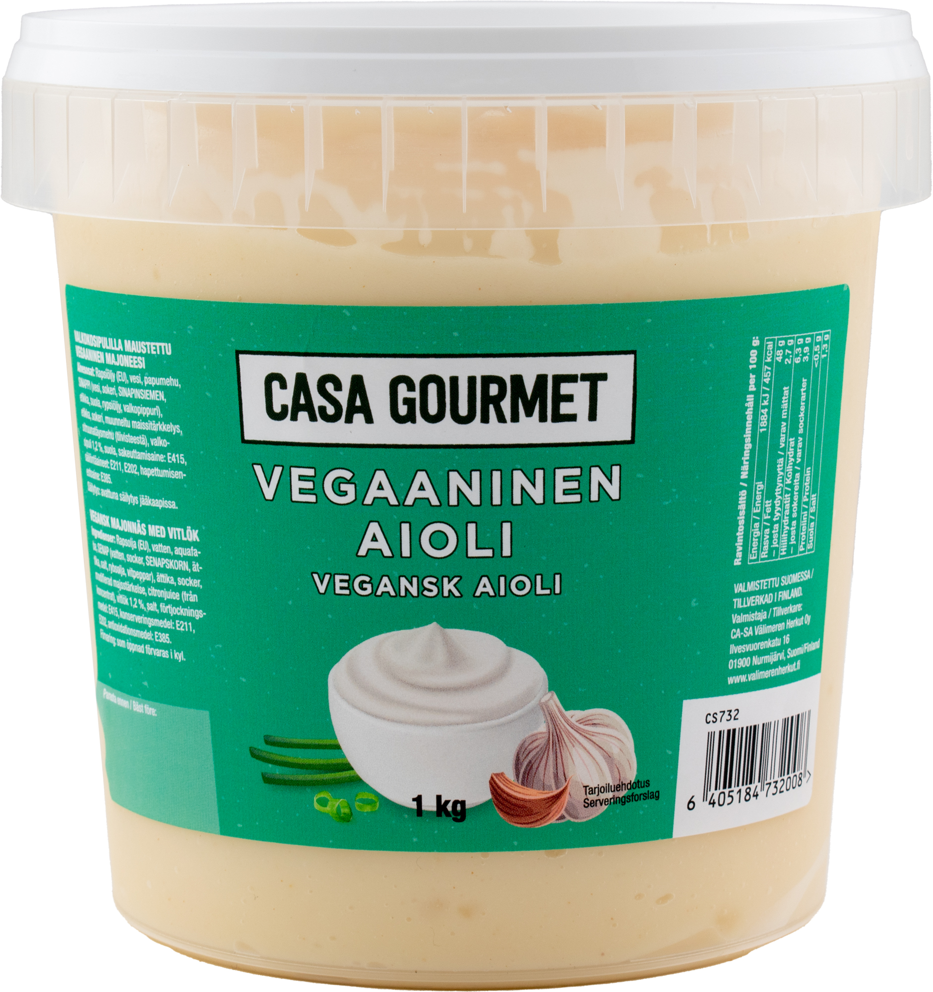 A vegan mayonnaise with garlic. Excellent to dip in with veggie sticks and between tortillas. Contains no animal originated ingredients.