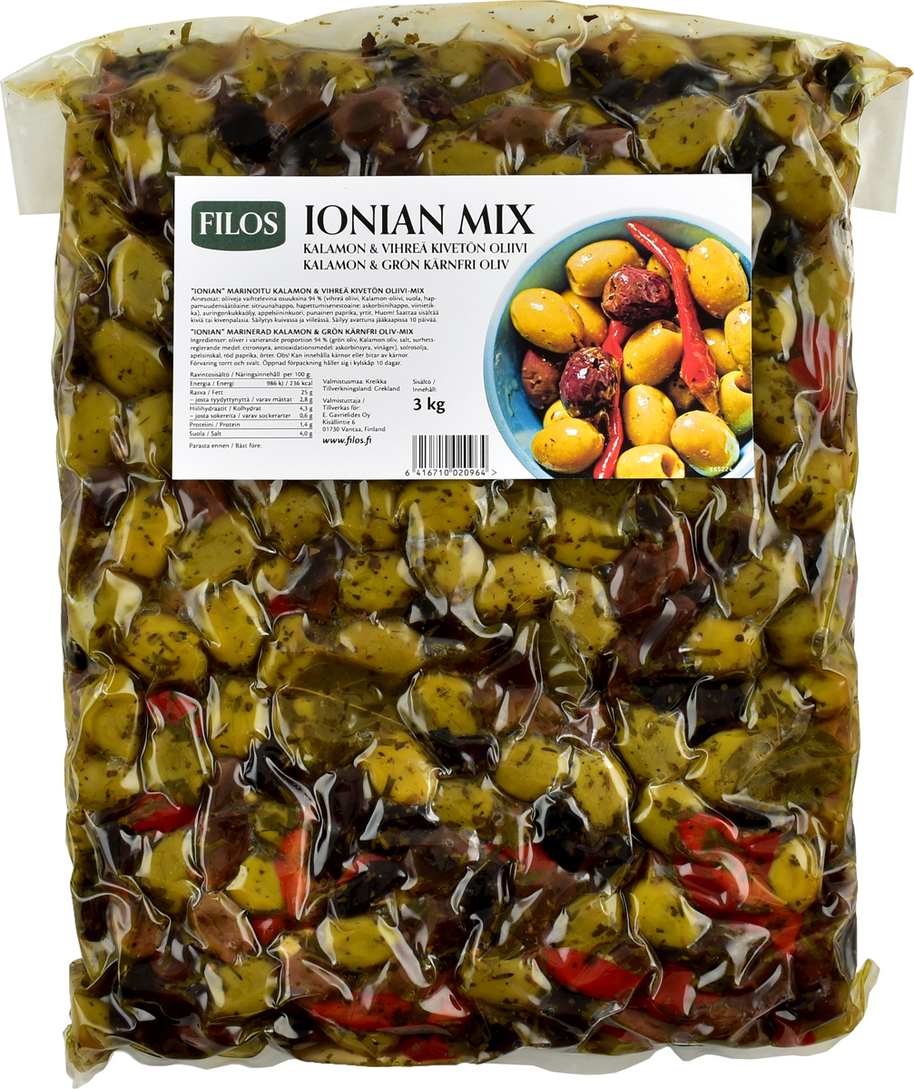 Ingredients: olives in varying proportion 94% (green olive, Kalamon olive, salt, acidity regulator: citric acid, antioxidant agent: ascorbic acid, vinegar), sunflower oil, pickled orange peel, red sliced pepper, herbs.