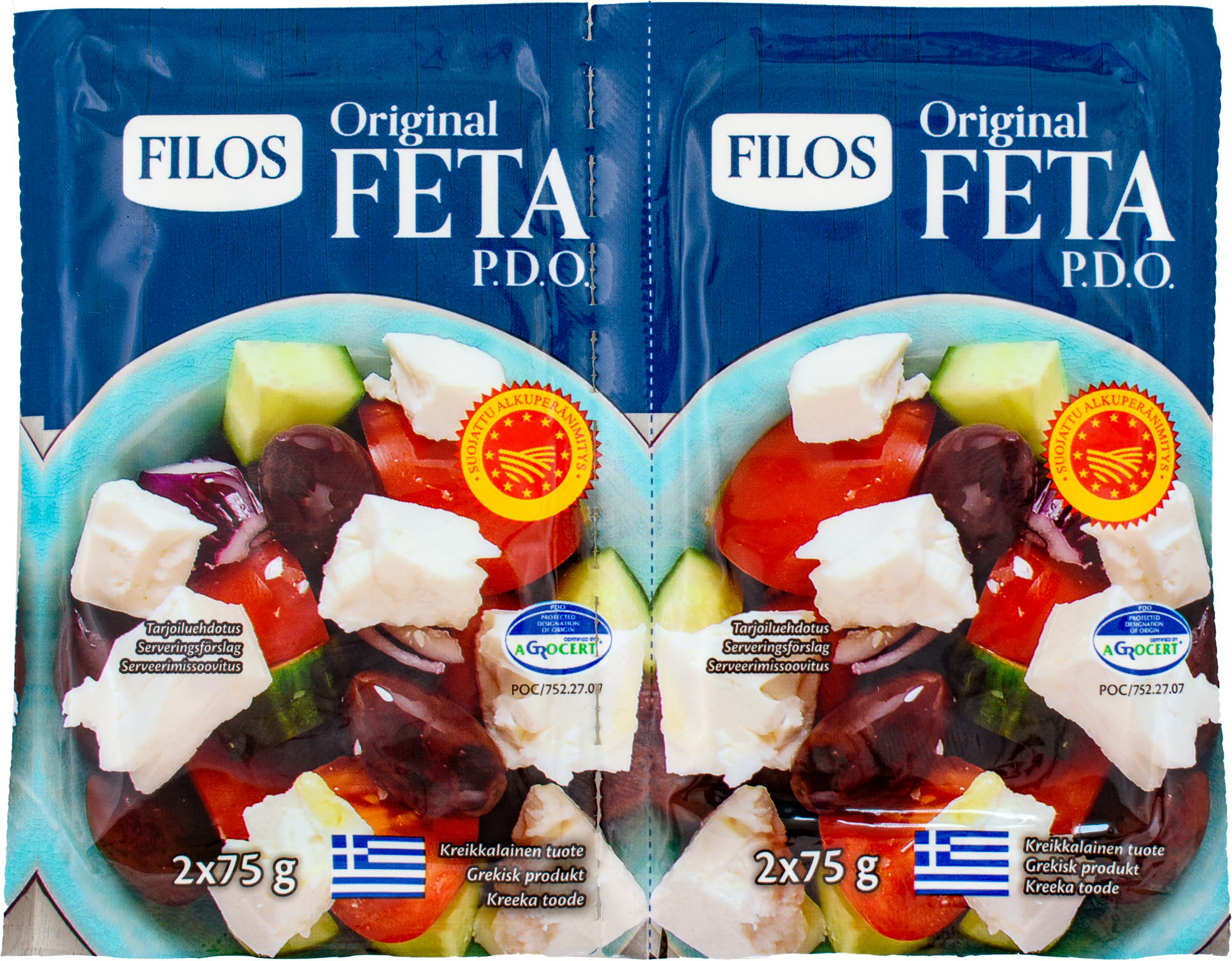 Filos original feta cheese 2 x 75 g in a convenient tear-off package.