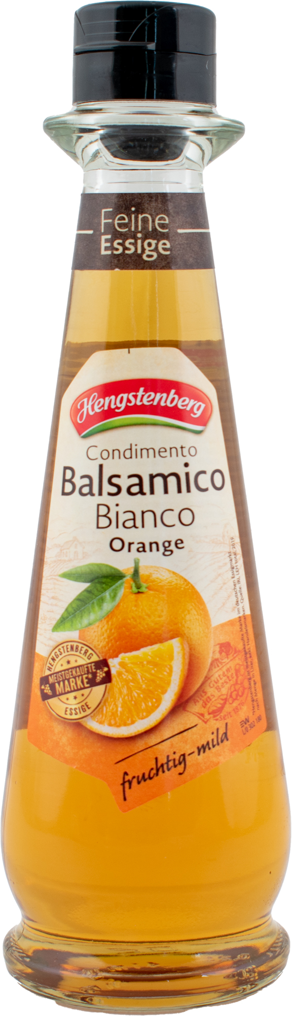 Ingredients: Balsamico vinegar (white wine vinegar, concentrated grape juice 20%) concentrated orange juice 1%, orange peel extract, natural orange aroma, natural aroma, antioxidant: POTASSIUM METABISULPHITE. Vegan.