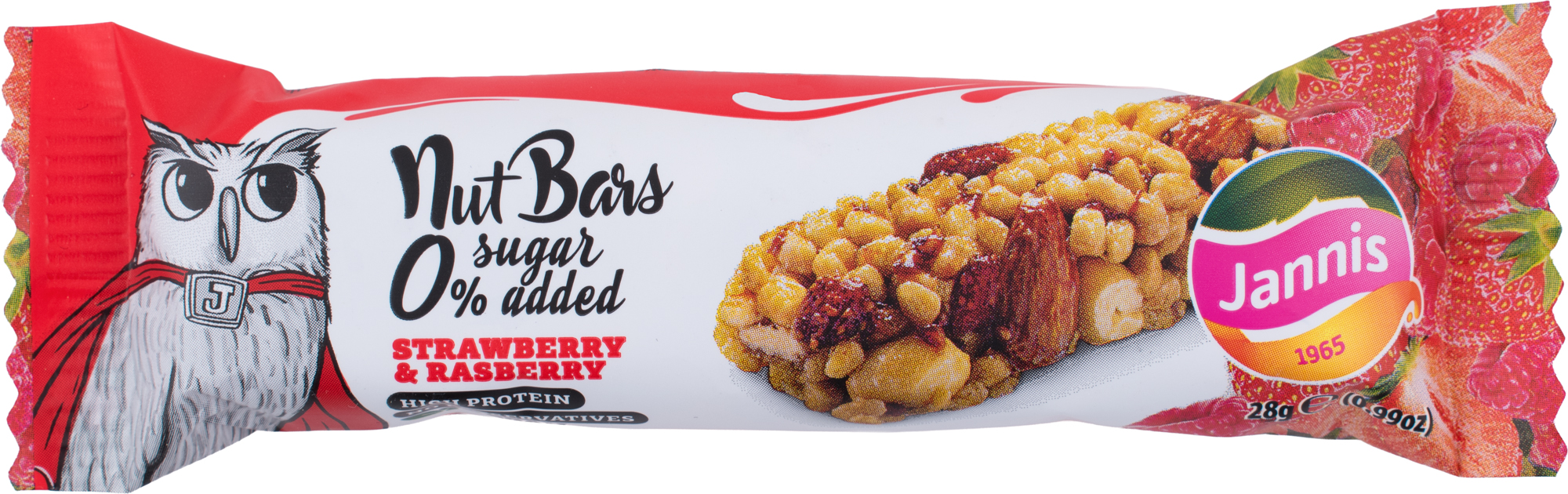 Ingredients: Chicory root fiber, 25% PEANUTS, crispy cereals (WHEAT protein, WHEAT flour), 17% ALMONDS,11% dehydrated strawberries (strawberries, concentraded juice of apple), 3% dehydrated raspberries (raspberries, concentraded juice of apple), coconut oil, humectant: glycerol, emulsifier: sunflower lecithin, flavorings, salt. May contain traces of SESAME SEEDS and other NUTS.