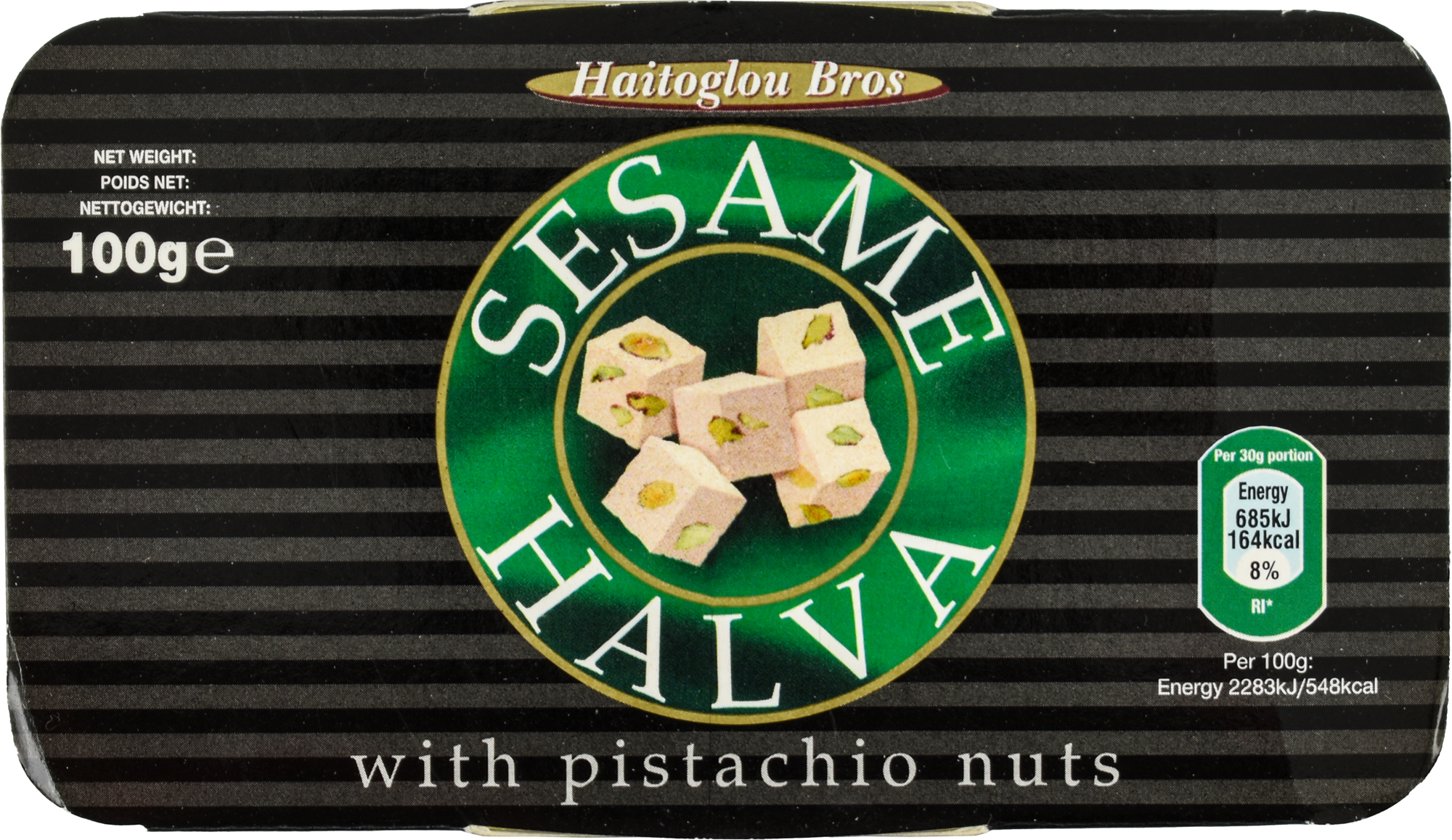 Ingredients: Tahini (crushed SESAME SEED), glucose-fructose syrup, PISTACHIO NUTS (7%), palm oil, saponaria officinalis extract, vanillin. May contain traces of PEANUTS or other NUTS.