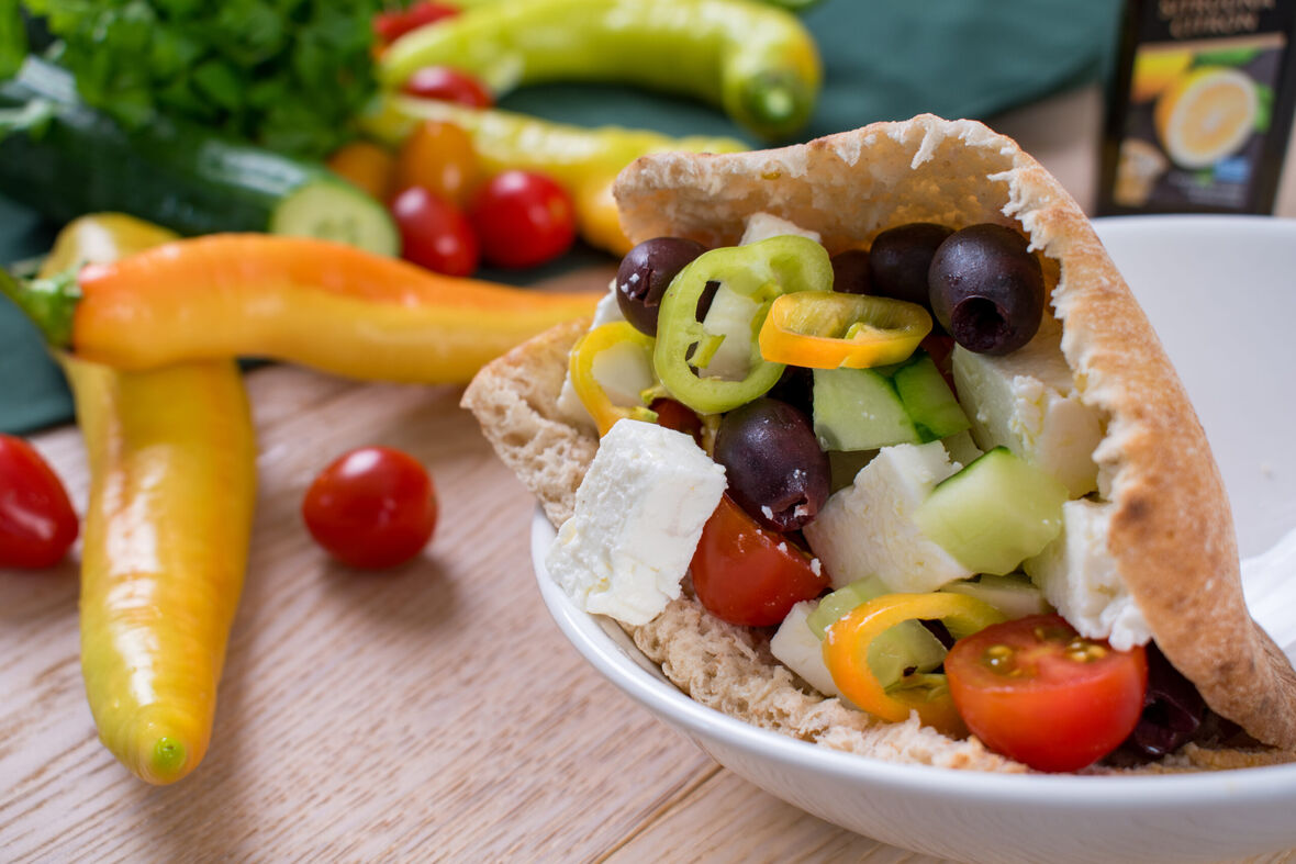 Tämä resepti tuo lautasellesi palan Välimerta. Tuoreet vihannekset kuten mehukkaat tomaatit, rapea kurkku ja makea punasipuli yhdistyvät aitoihin kreikkalaisiin makuihin: Filos fetajuustoon, kalamata-oliiveihin ja aromaattiseen oliiviöljyyn. Kyseessä on moderni versio suositusta kreikkalaisesta maalaissalaatista, joka tunnetaan myös nimellä fetasalaatti tai horiatiki. Kreikkalainen (tai yleisemmin välimerellinen) ruokavalio on tunnettu terveellisyydestään ja yksinkertaisista mutta laadukkaista raaka-aineistaan. Tässä reseptissä nämä maut pääsevät oikeuksiinsa helposti syötävässä muodossa: rapeaksi paahdetun pitataskun sisällä.