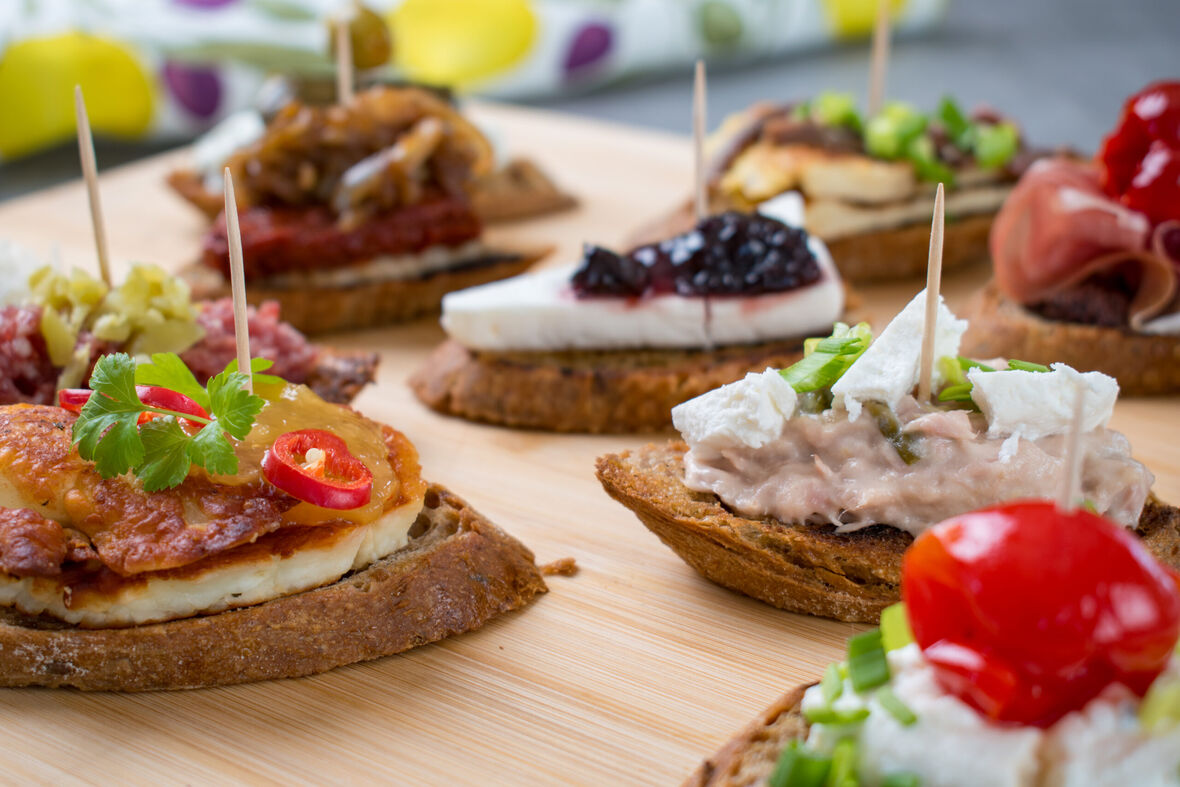 Aseta paahdetun leivän päälle munakoisosalaattia ja lävistä cocktailtikulla päälle aurinkokuvattu tomaatti. Viimeistele annos karamellisoidulla sipulilla.
