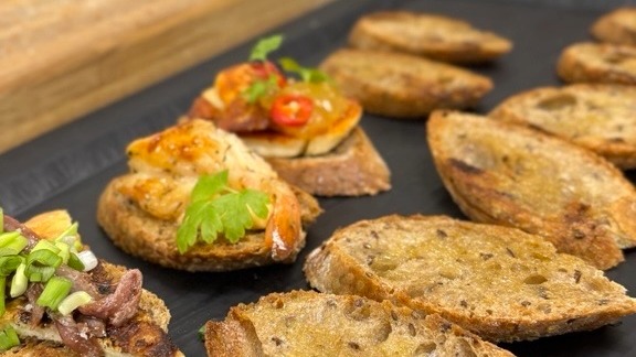 Paahdettuna leipäviipaleet maistuvat paremmalta. Kosteuta ekstra-neitsytoliiviöljyllä. Sivele leivälle chiliaiolia ja lävistä jättirapu cocktailtikulla päälle. Koristele silputulla lehtipersiljalla.
