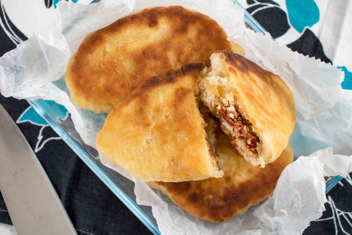 Tiganopsomo (paistettu leipä) aurinkokuivattu tomaatti-fetatäytteellä