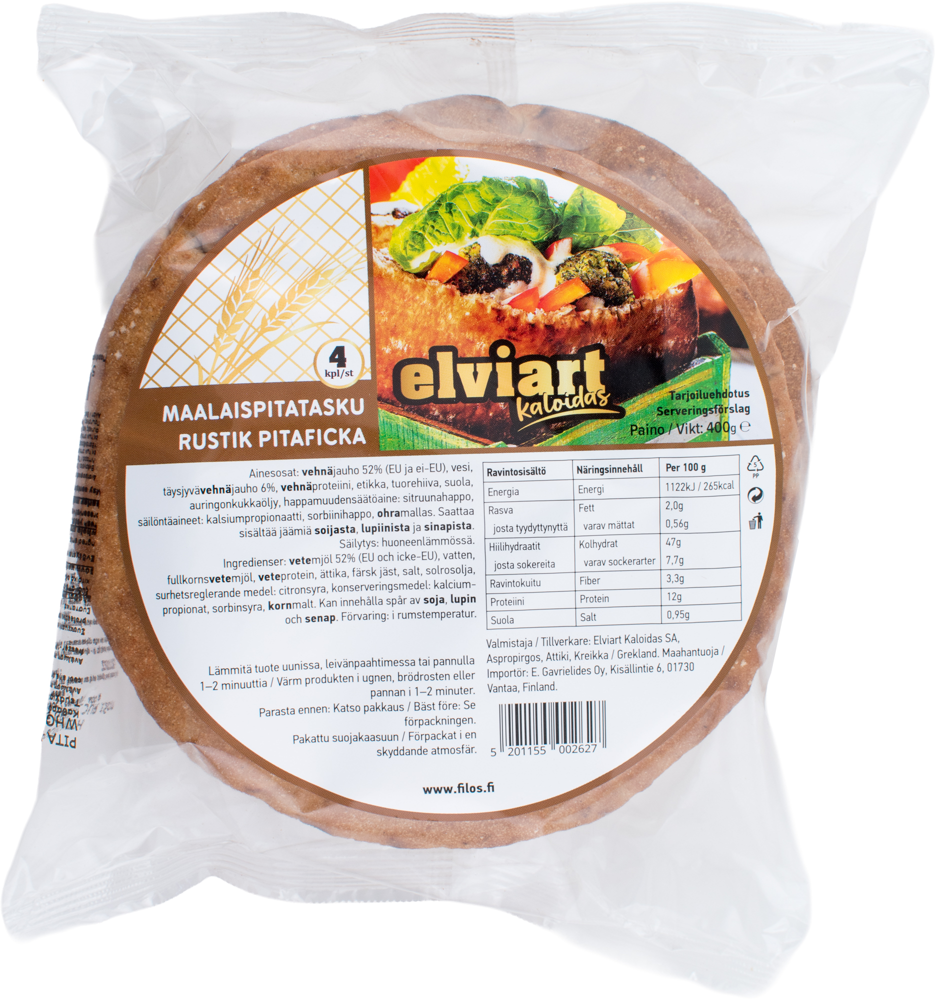 Herkullinen maalaispitatasku. Leipä on valmiiksi halkaistu, eikä murene, kun sen avaa. Leivän täytteeksi sopivat liha, kana, kasvikset ja tahnat. Lisää makua saat esimerkiksi Filos balsamicokastikkeista. Pakkaus sisältää neljä pyöreää 100 g pitataskua.
