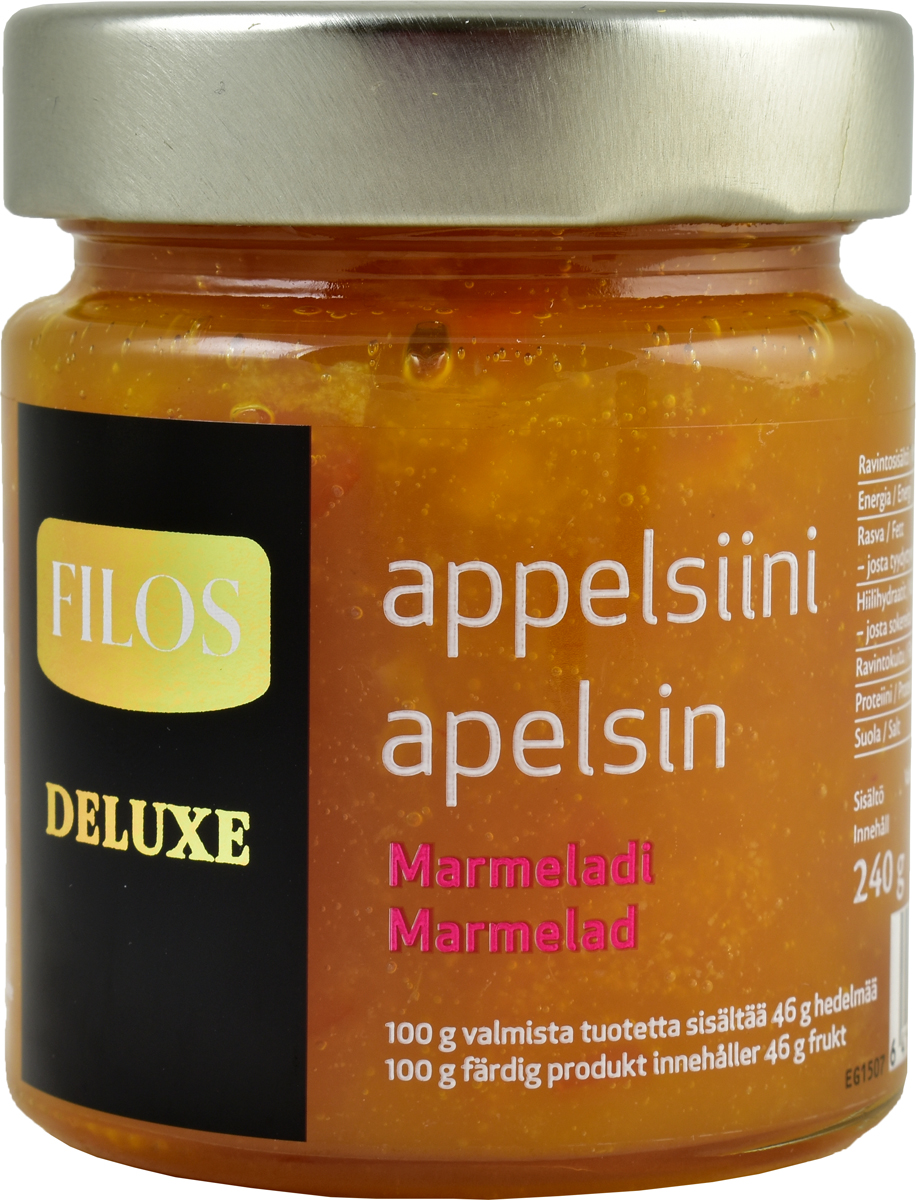 Filos deluxe appelsiinimarmeladi sisältää runsaasti appelsiinin hedelmää. Välimeren maissa appelsiini kypsyy talvella ja siitä tehdään hilloa kesää varten. 100g tuotetta sisältää 46g hedelmää.