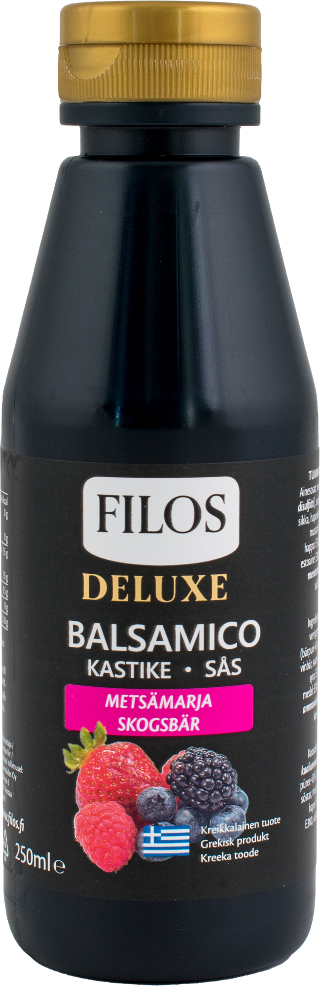 Filos kreikkalainen balsamicokastike on ainutlaatuinen yhdistelmä hapokkuutta ja makeutta. Tumman balsamicokastikkeen salaisuus on sen reseptissä, jossa on käytetty auringon paahtamia rypäleitä. Metsämarjat tuovat kastikkeelle ihanan herukkaisen maun.