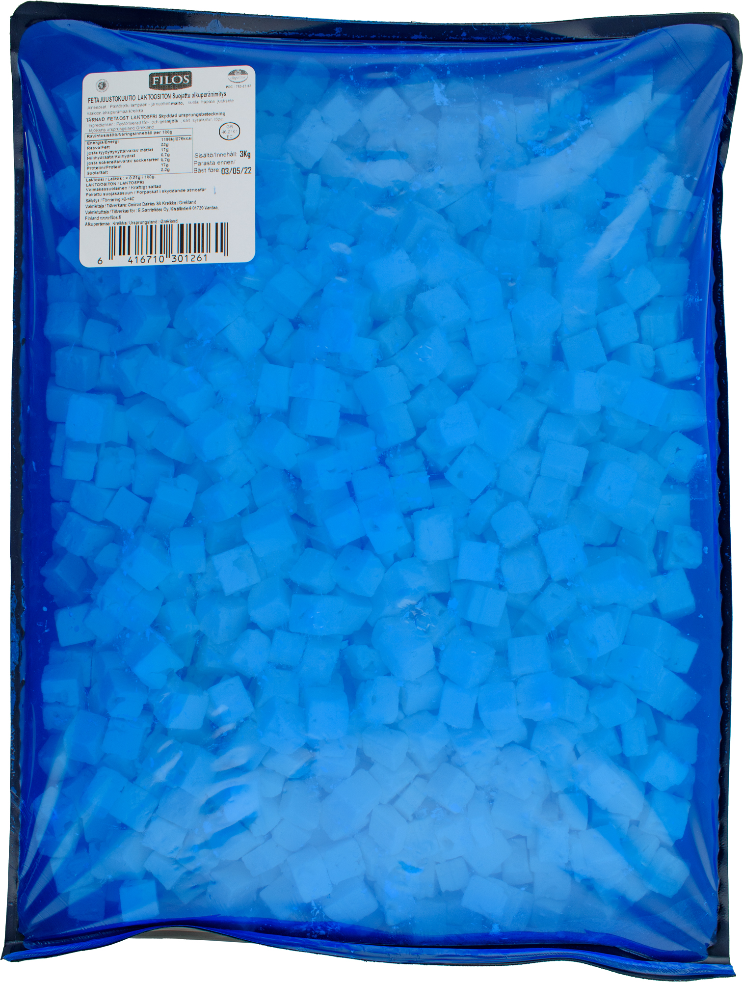 Filos laktoositon fetajuustokuutio on pakattu kevyeen muovipakkaukseen. Tuote ei sisällä lainkaan nestettä, joten sitä ei tarvitse valuttaa.