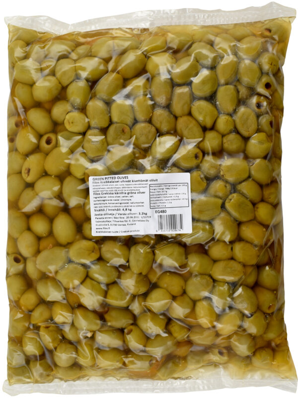 Filos vihreät kivettömät oliivit ovat maukkaita kreikkalaisia oliiveja, jotka sopivat esimerkiksi salaatteihin tai marinoituina alkupalaksi.