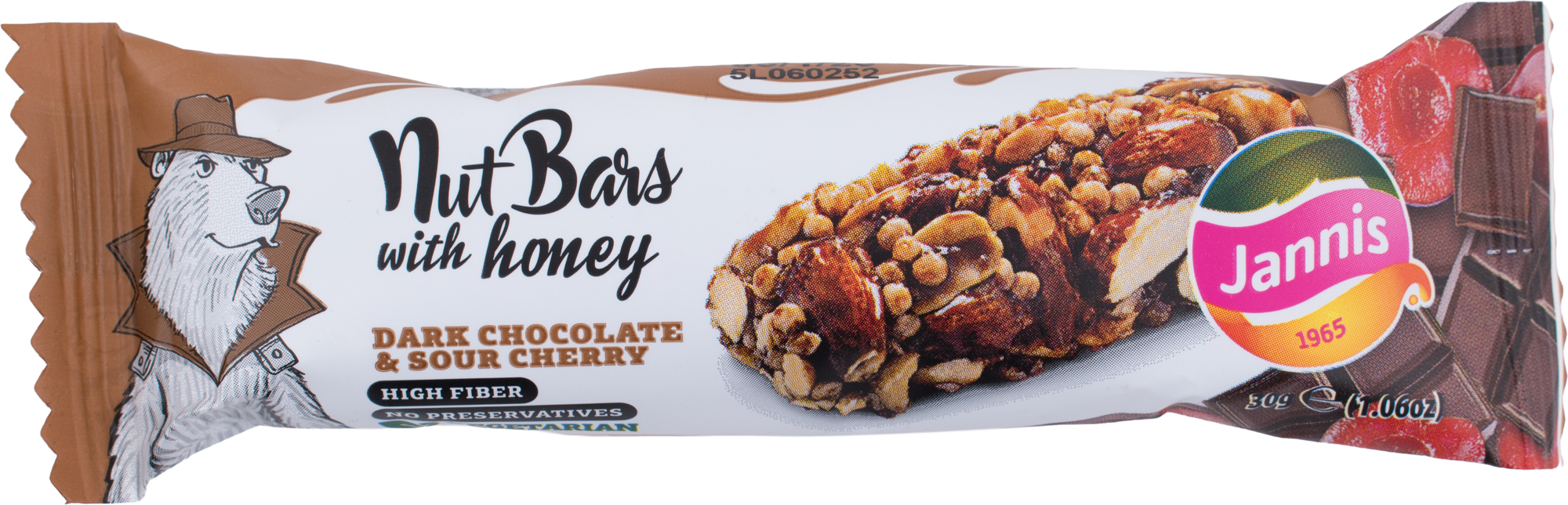 Ainesosat: 27% hunaja, 27% MAAPÄHKINÄ, 21% MANTELI, 7% HASSELPÄHKINÄ, 7% kuivattu hapankirsikka (kuivattu hapankirsikka, omenmehutiiviste), rapea muro (riisijauho), sikurijuurikuitu, 5% tumma suklaa (kaakaomassa, sokeri, kaakaovoi, emulgointiaine: auringonkukkalesitiini, aromit), aromit. Tummassa suklaassa kaakaota vähintään 71%. Saattaa sisältää jäämiä SEESAMINSIEMENIÄ, MAITOA ja muita PÄHKINÖITÄ.
